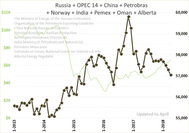 Without the production increases in the USA, the World’s oil & condensate production has been decreasing.