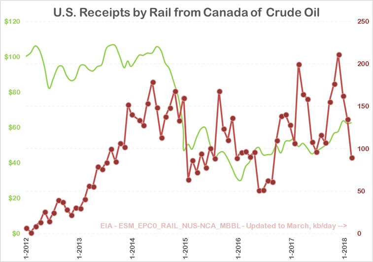 Do you have Permian output at 3.4 Mb/d? I would estimate Permian conventional at 550 kb and EIA has Permian tight oil at 2450 kb/d in April 2018, so I get 3000 kb/d for Texas and New Mexico Permian Basin output in April 2018. Not sure beyond April. The trend since Nov 2017 for Permian LTO output has been an annual rate of increase of 400 kb/d. Agree that a lot of the rail is being used for frack sand, so that capacity may not be there for rail. There supposedly is 300 kb/d of local refinery capacity so even without rail there is 3.4 Mb/d between pipeline and refinery. So if those numbers are right there is still 400 kb/d of room for growth after April 2018.