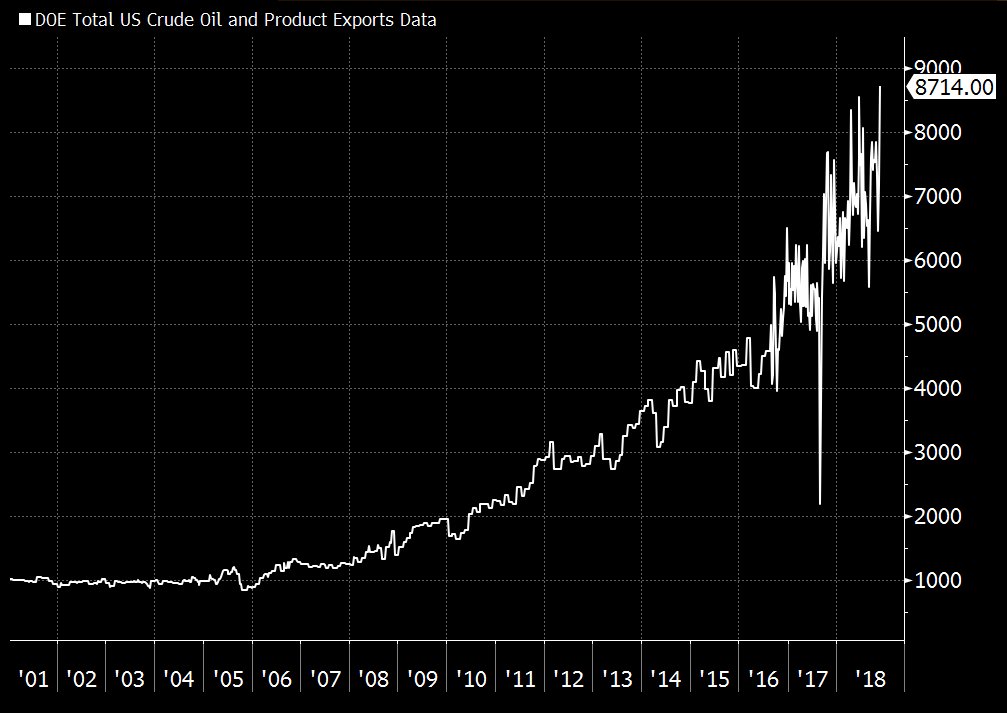 US exports (crude+products) hit a new record high: 8.7 million b/day. But inventories still increased.