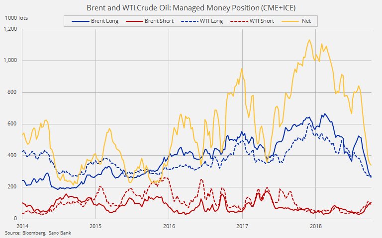 2018-12-02 (Saxo Bank) Overall the combined net-long crude oil position in WTI and Brent dropped to 339k lots a near three-year low