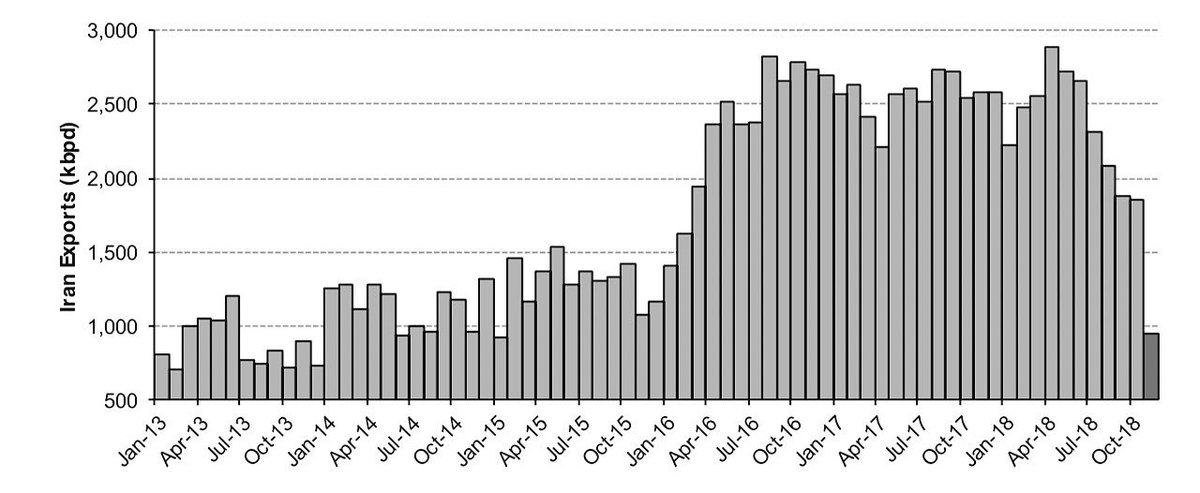 2018-12-06 (Kepler) Tehran’s exports fell to about 1 million barrels per day in November, compared with an average of 2.7 million barrels per day from April to June.