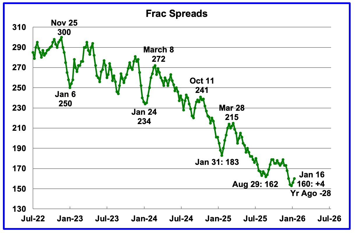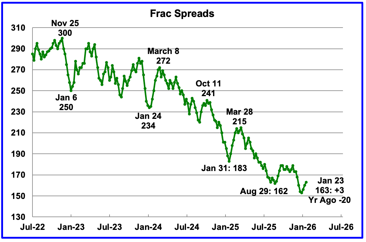 The frac spread count rose by 3 to 163. From one year ago, it is down by 20 spreads and is down by 52 since March 28.