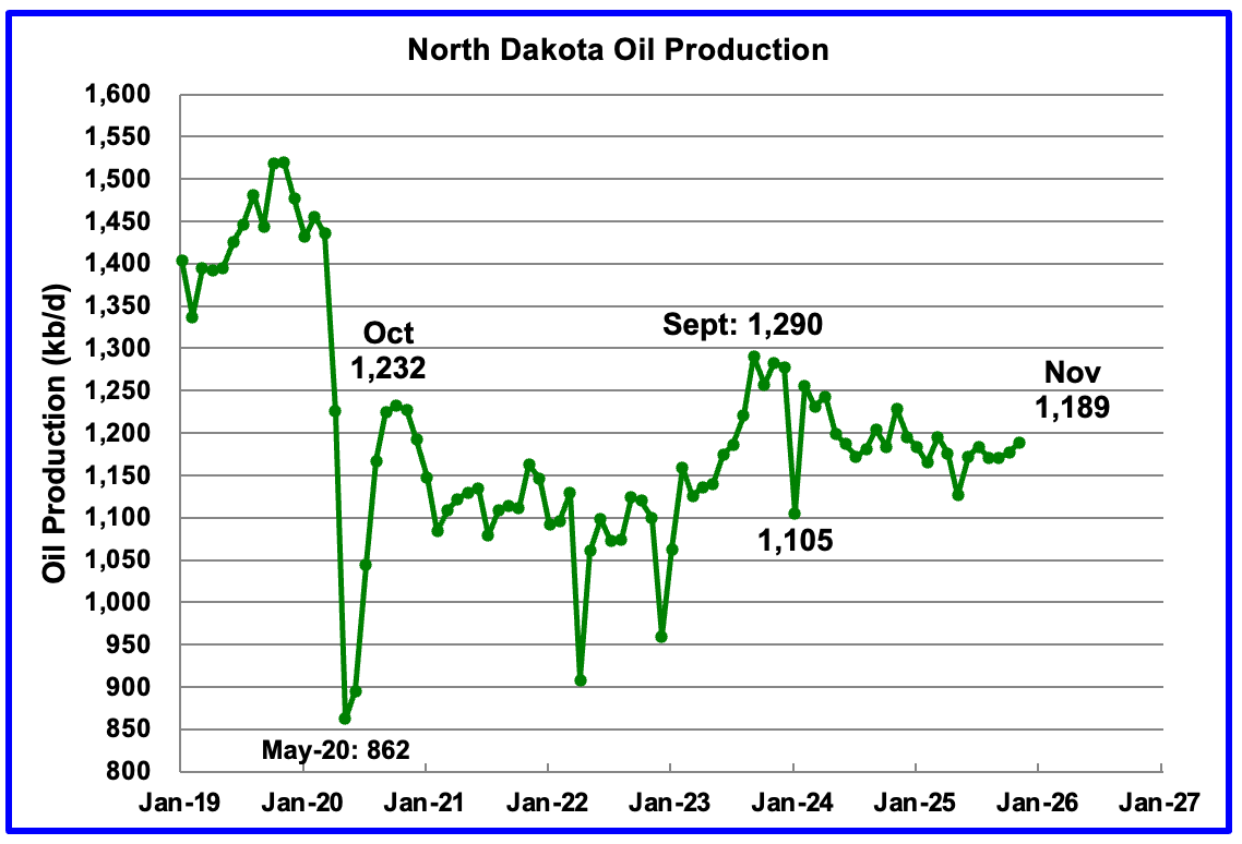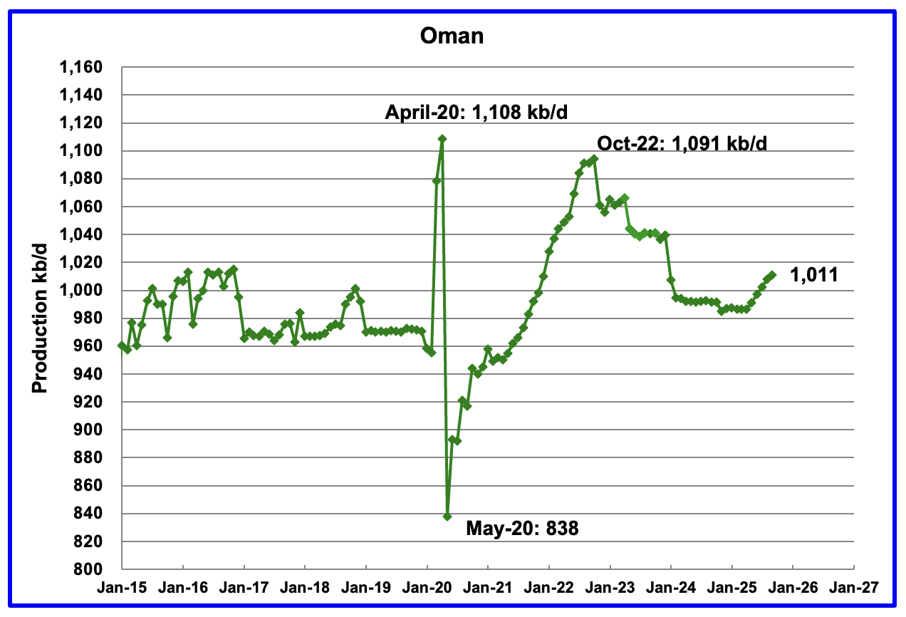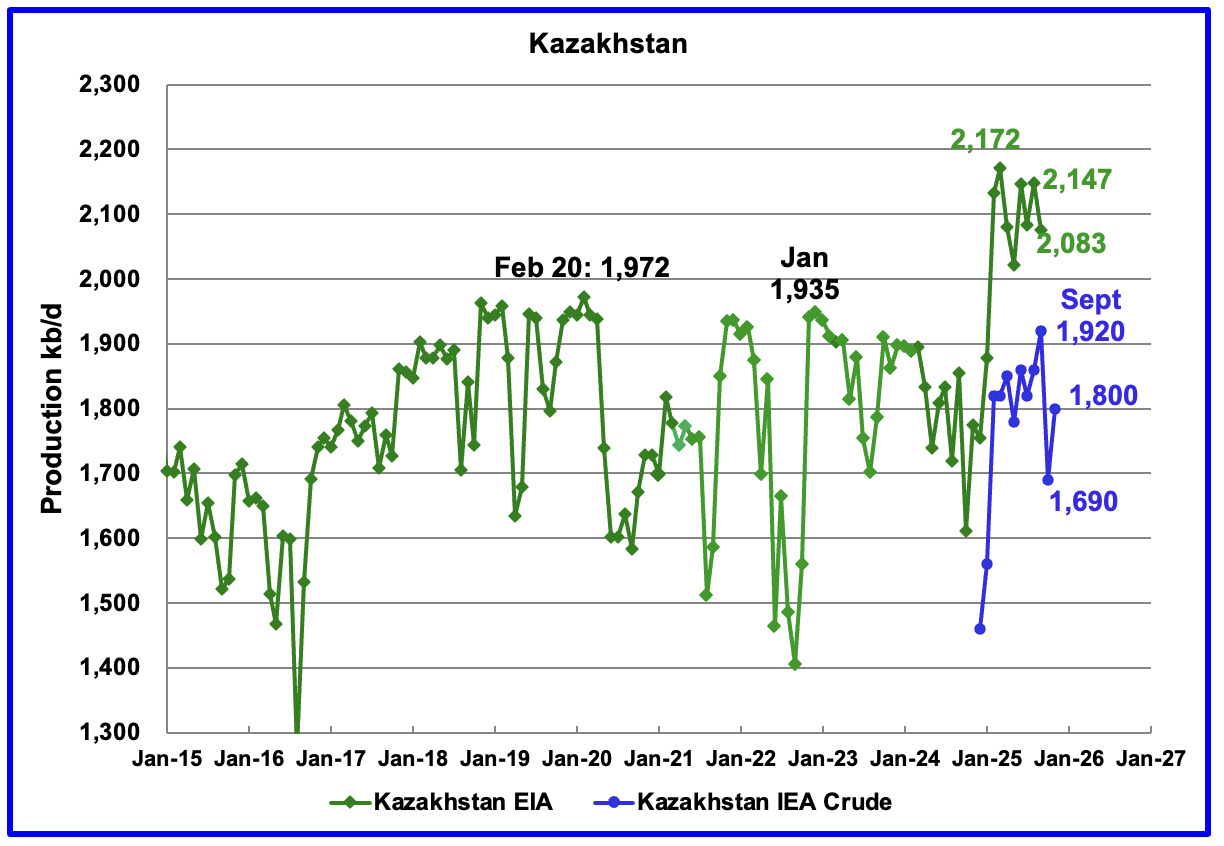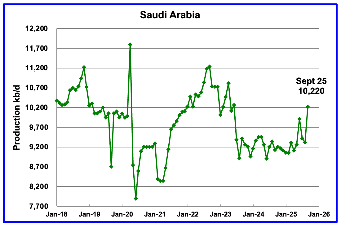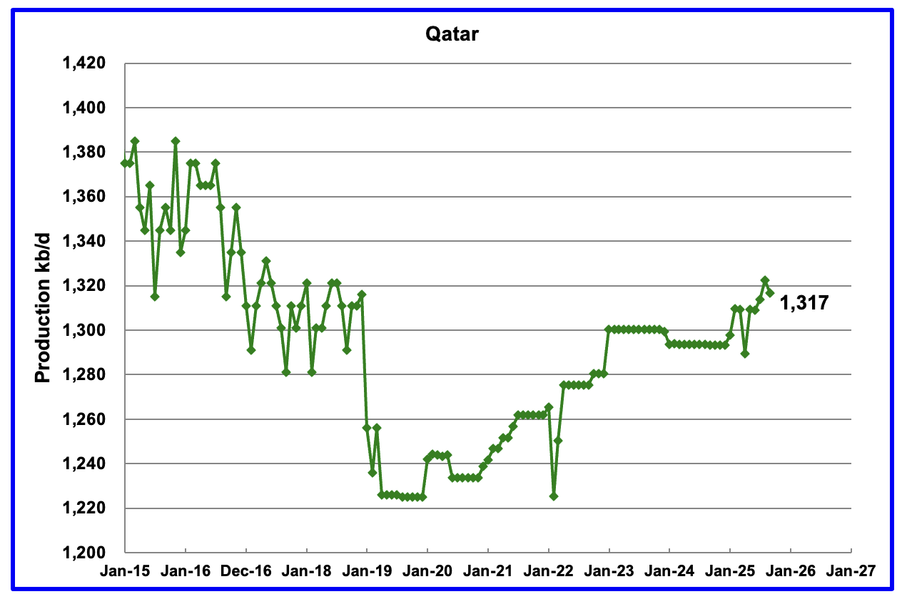 Qatar is now providing the EIA with monthly updated oil production back to January 2025. Qatar’s September’s output was reported to be 1,317 kb/d down 5 kb/d from August