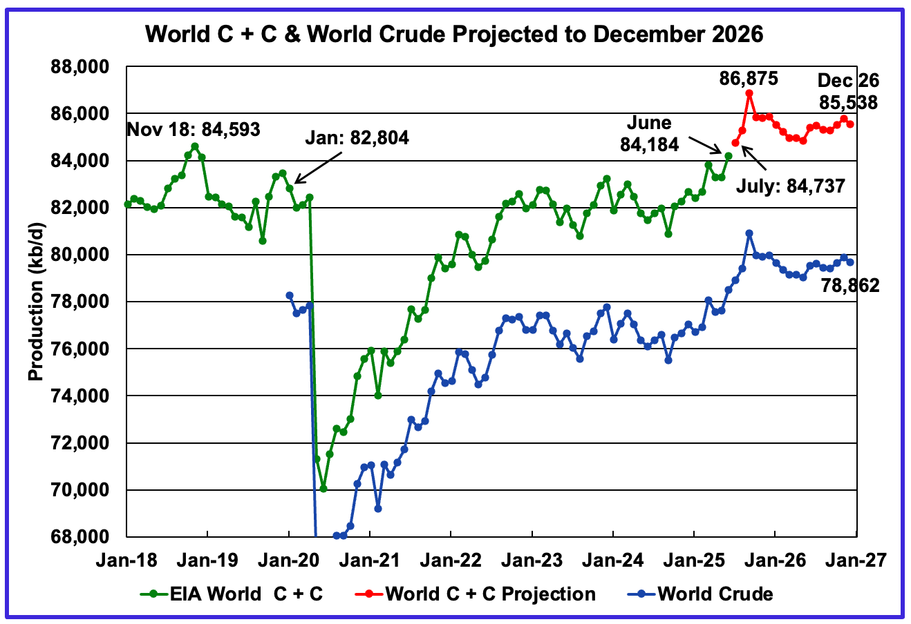 This chart has been updated to project World C + C production out to December 2027. It uses the January 2026 STEO report along with the International Energy Statistics to make the projection. Production in October 2025 is projected to increase by 47 kb/d to 86,080 kb/d, if correct, another new World Peak Oil next month.
