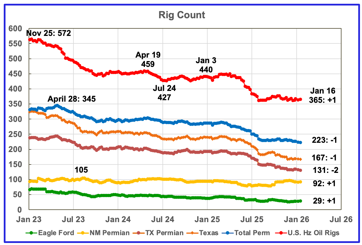 – US Hz oil rigs rose by 2 to 367, down 83 since April 2025 when it was 450. The 2 rigs were added in Colorado. It was also up 5 from the low of 362 first reached in the week ending August 1. The rig count is down 18% since April 2025.