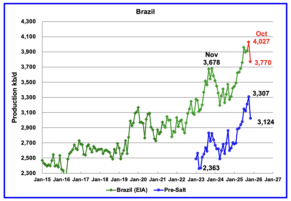 Brazil’s National Petroleum Association (BNPA) reported that production rose in October to a new high of 4,027 kb/d and then dropped by 257 kb/d in November to 3,770 kb/d. The pre-salt blue graph tracks Brazil’s trend. Pre-salt production decreased by 283 kb/d in November to 3,124 kb/d.