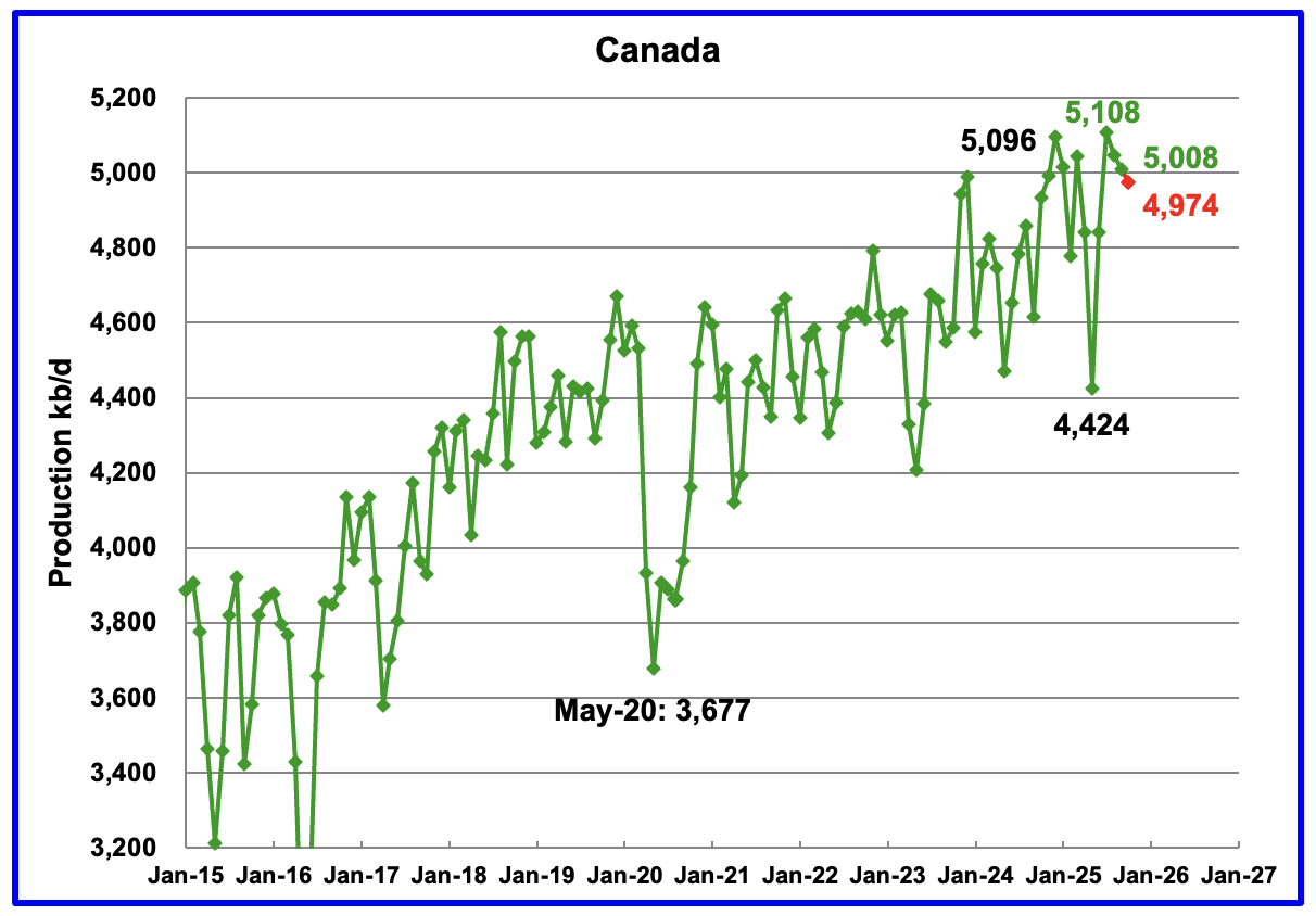 Canada’s oil production decreased by 39 kb/d in September to 5,008 kb/d.