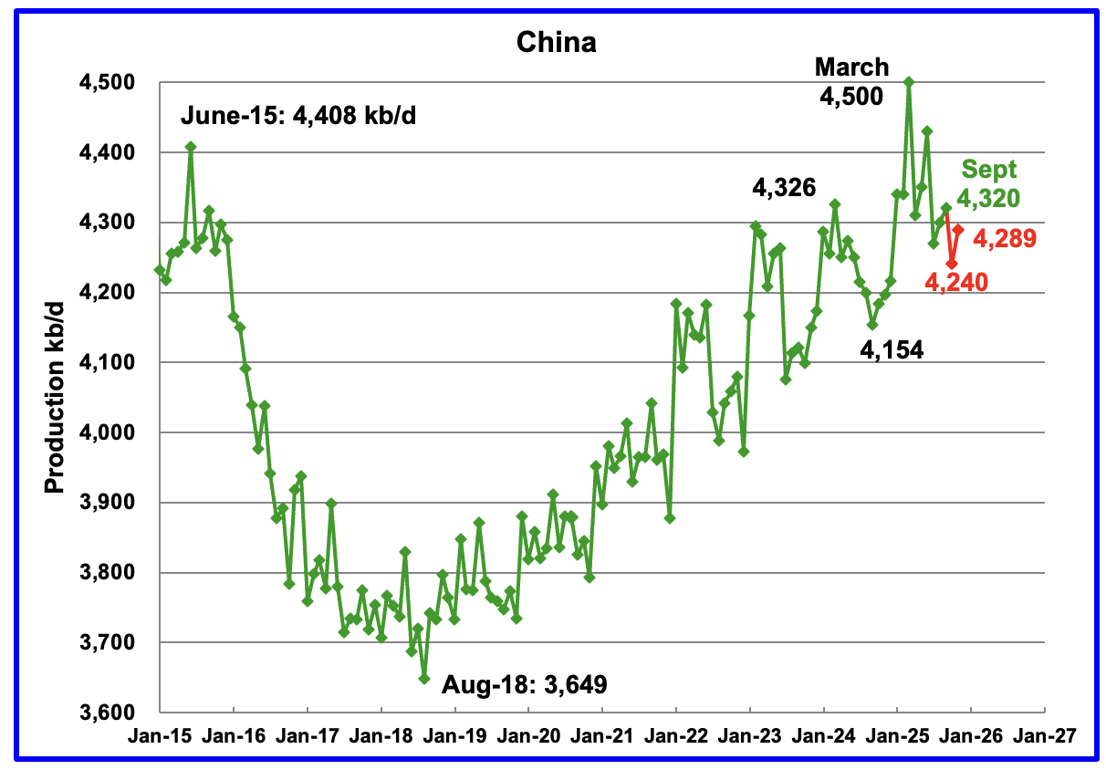 The China National Bureau of Statistics reported October production dropped by 80 kb/d to 4,240 kb/d and then in November rose by 49 kb/d to 4,289 kb/d.