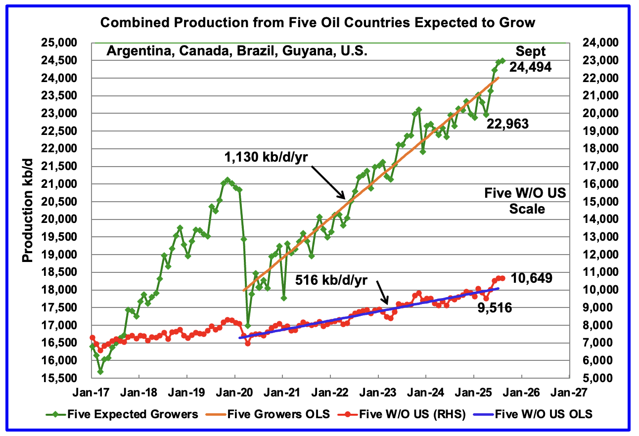 To show the impact of US growth over the past 5 years, U.S. production was removed from the five countries and that graph is shown in red. The production growth slope for the remaining four countries has been reduced by 614 kb/d/yr to 516 kb/d/yr.