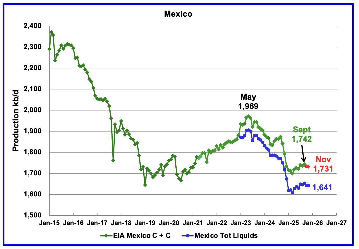 According to the EIA, Mexico’s September output rose by 7 kb/d to 1,742 kb/d.