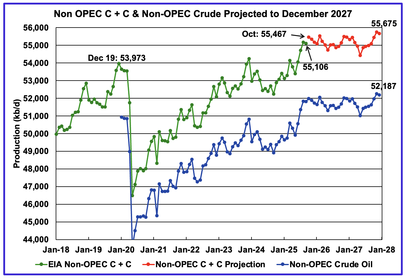 Using data from the January 2026 STEO, a projection for Non-OPEC oil output was made for the period October 2025 to December 2027. (Red graph). Output is expected to grow by 569 kb/d from September 2025 to reach 55,675 kb/d in December 2027.