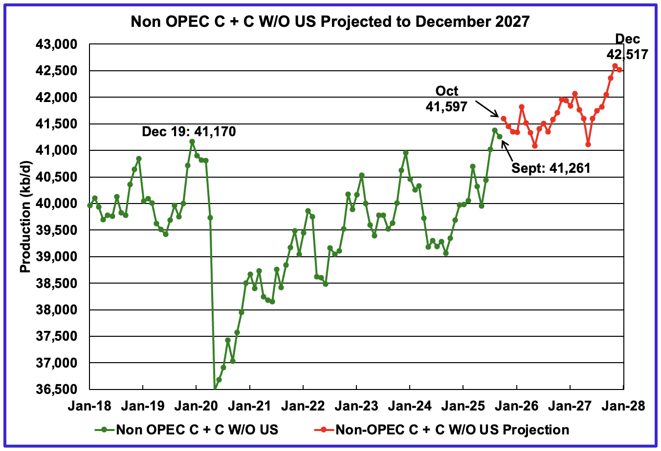 From September 2025 to December 2027, production in Non-OPEC countries W/O the U.S. is expected to increase by 1,256 to 42,517 kb/d.