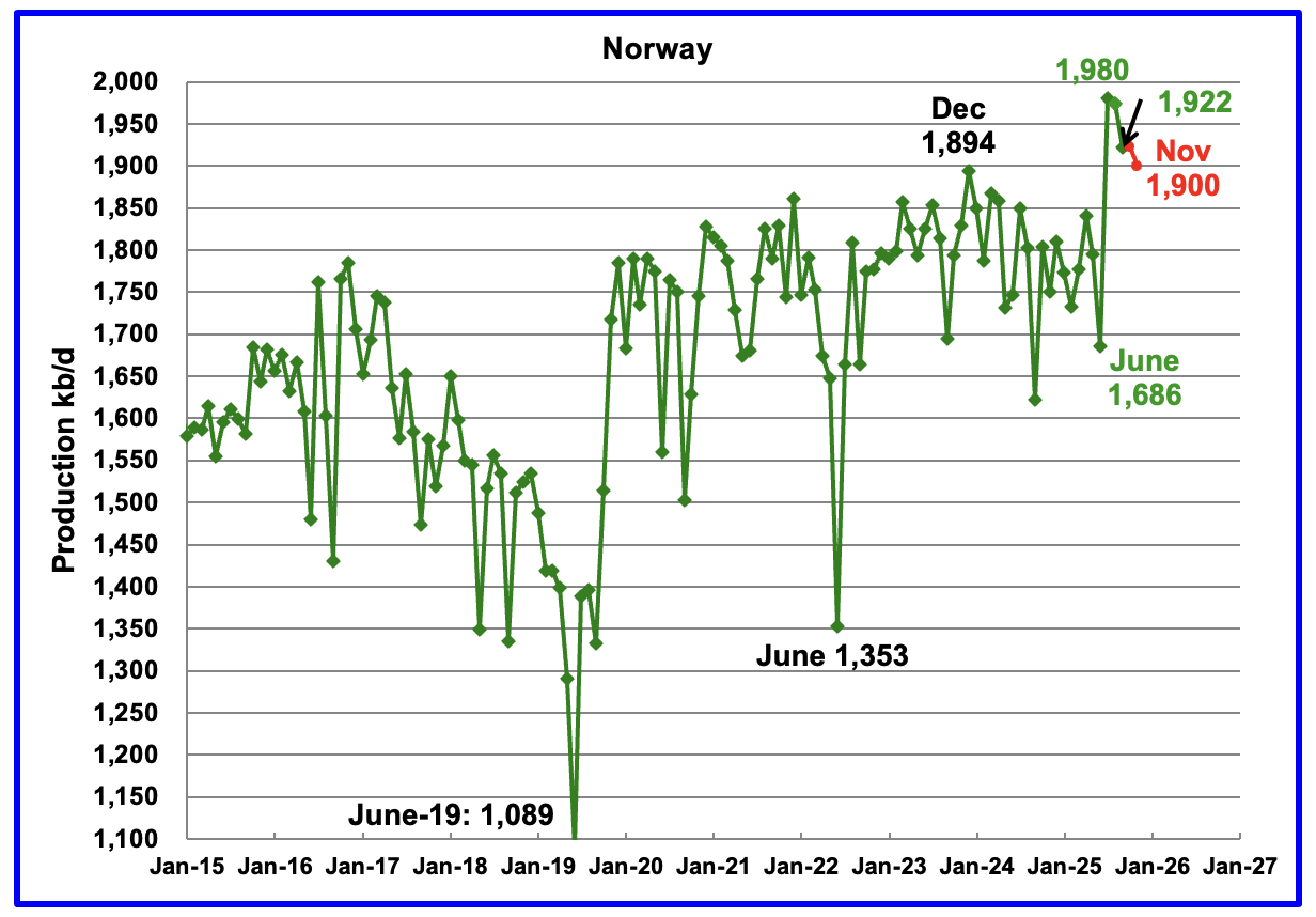 The EIA reported Norway’s September’s production dropped by 52 kb/d to 1,922 kb/d.