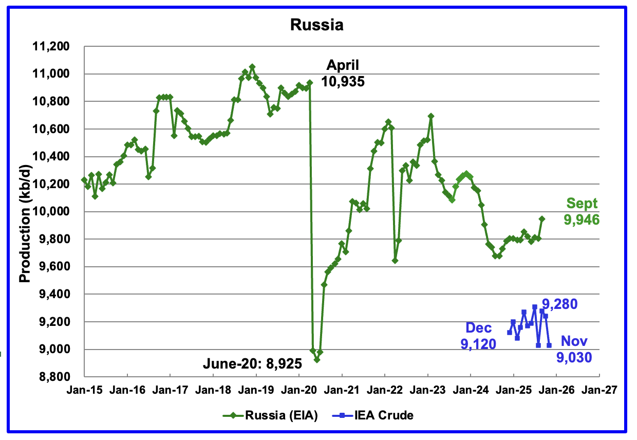 Up to August 2025 Argus Media used to report OPEC + crude production. That monthly report has now been discontinued. The above chart now also shows Russian production as reported by the IEA. It is difficult to assess the accuracy of the IEA report but over the last few months the IEA’s Russian production has been around 100 kb/d to 150 kb/d higher than Argus’ Media. The best that can be done at this time will be to compare the production trends between the EIA and the IEA. I think that Russian oil production continues to be a major state secret at this time because of the damage being caused by the heavy bombing to its related crude oil processing facilities.