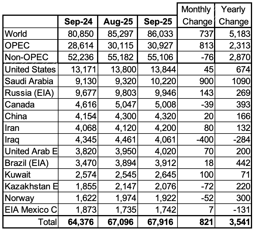 Above are listed the World’s 13th largest oil producing countries. In August 2025 these 13 countries produced 78.6% of the World’s oil. On a MoM basis, production increased by 821 kb/d in these 13 countries while on a YOY basis production rose by 3,541 kb/d. Note the YoY increases from Saudi Arabia, U.S. and Brazil