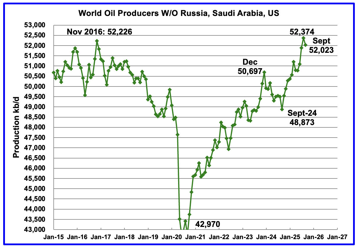 Production in the remaining countries has been slowly increasing since the September 2020 low of 42,970 kb/d. However production dropped in September 2025 by 351 kb/d to 52,023 kb/d.