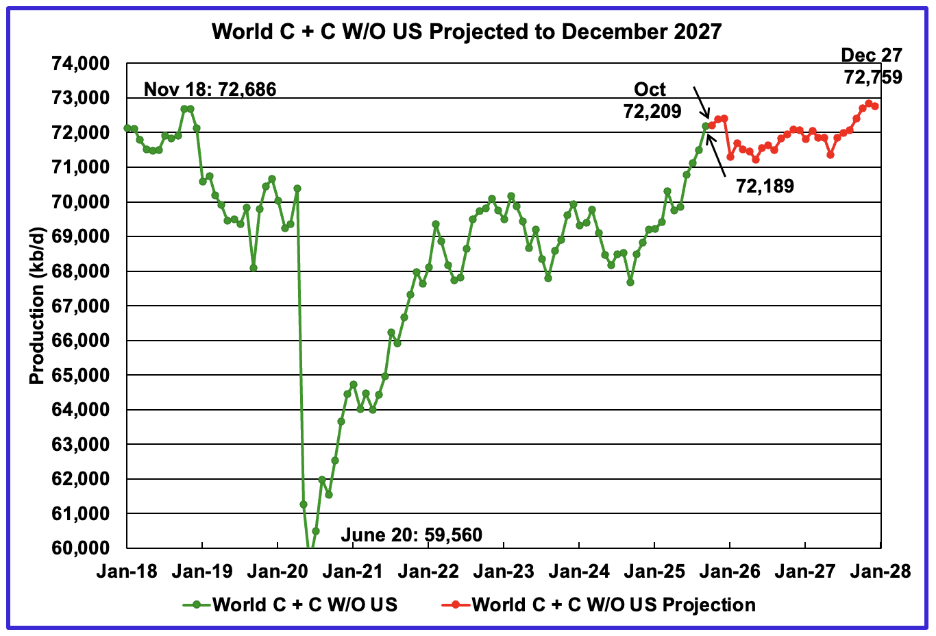The projection is forecasting that December 2027 World W/O US oil production will be 72,759 kb/d, an increase of 570 kb/d from September 2025.