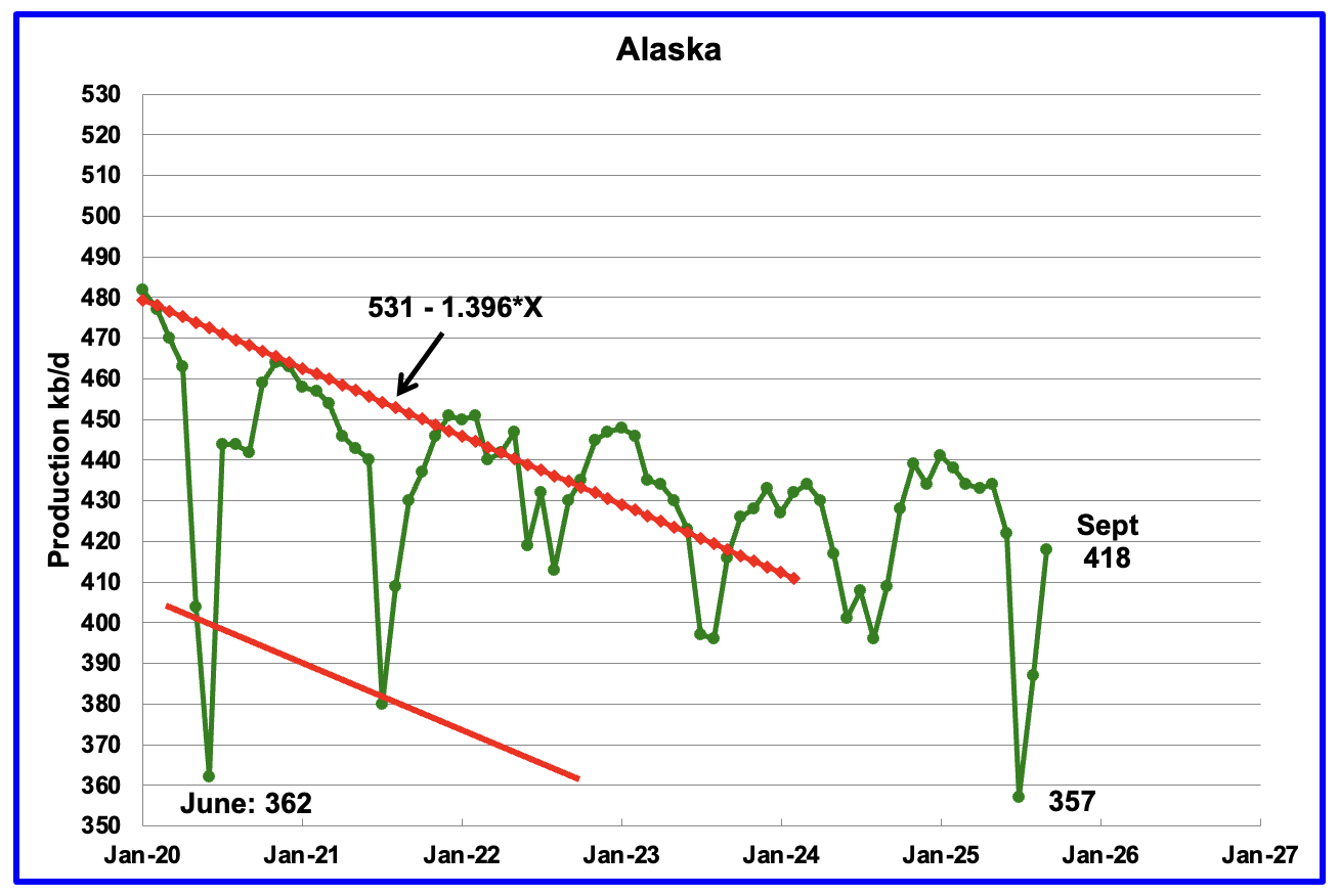 Note the almost flat production in the Onshore L48 for July, August and September, 11,437 kb/d, 11,432 kb/d and 11,443 kb/d respectively, red graph. The difference between the 44 kb/d increase in the overall US production vs the almost flat production in the Onshore L48 is the 31 kb/d increase from Alaska.