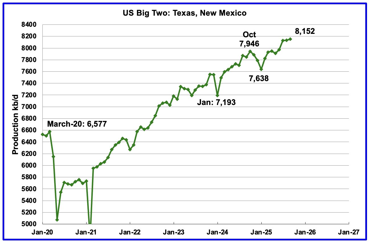September’s production in the Big Two states increased by a combined 20 kb/d to 8,152 kb/d, a new high. Clearly these two states were the drivers of US oil production growth up to September 2025.