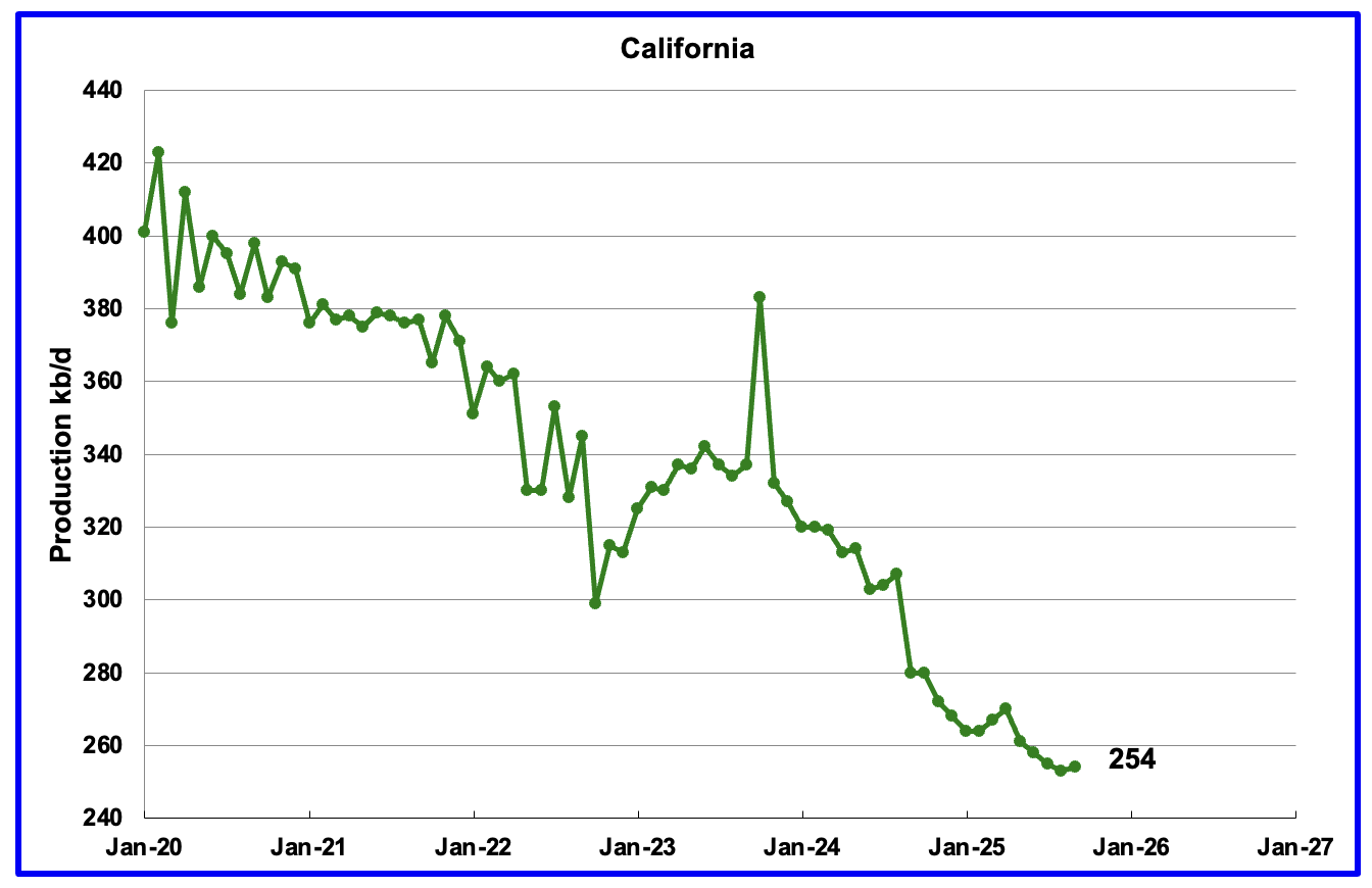 California’s overall declining production trend continues but September had a minimal rise. September’s production rose by 1 kb/d to 254 kb/d. YoY production dropped by 26 kb/d.
