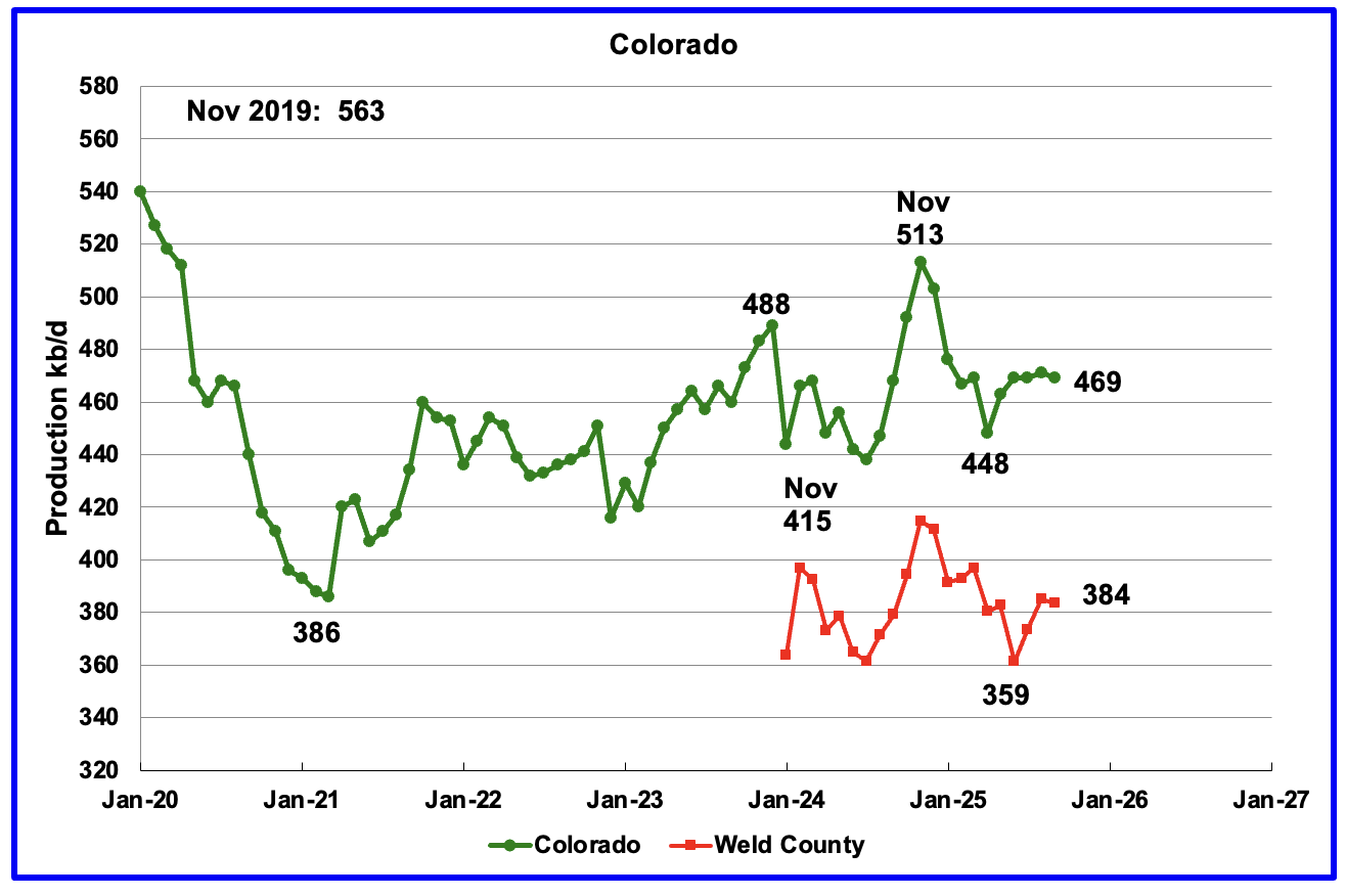 The biggest oil producing county in Colorado is Weld County and its production has been added to the chart. The two graphs have been almost parallel since January 2024 but diverged over the last two months. Weld’s production dropped by 1 kb/d in September to 384 kb/d.