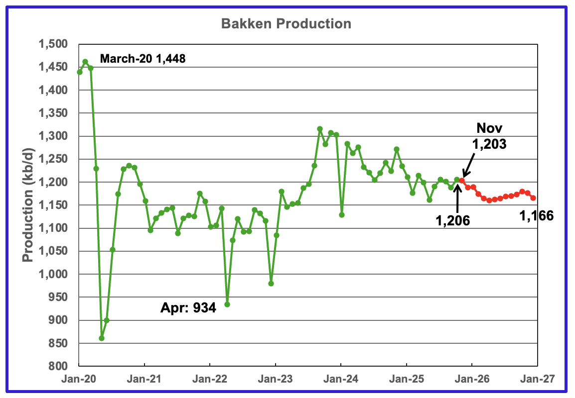 The DPR/STEO reported that Bakken’s October output rose by 17 kb/d to 1,206 kb/d. November production is expected to decrease by 3 kb/d to 1,203 kb/d. The STEO/DPR projection, red markers, shows output dropping to 1,166 kb/d in December 2026.