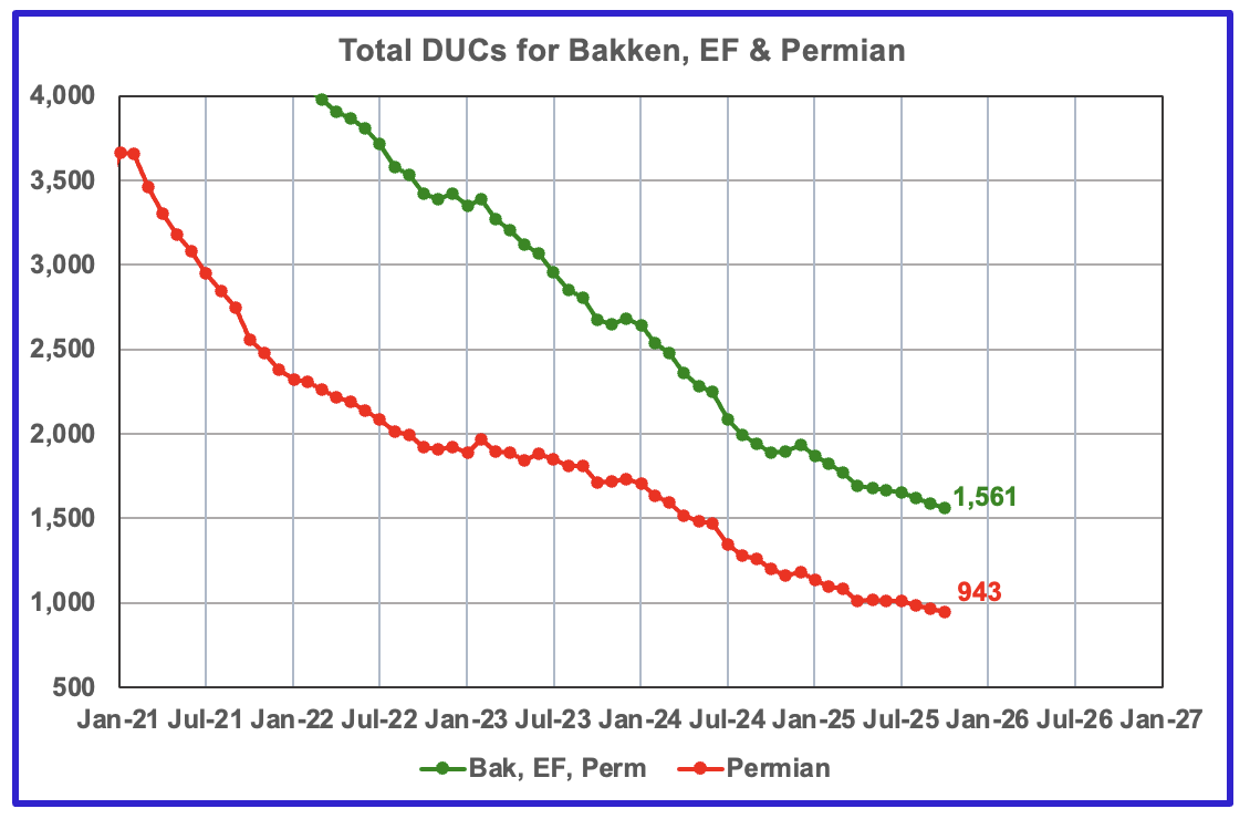 The number of DUCs available for completion in the Permian and the three major DPR regions has returned to a dropping trend. October’s DUC count for the three basins dropped by 27 to 1,561. In the Permian the DUC count dropped by 23 to 943.