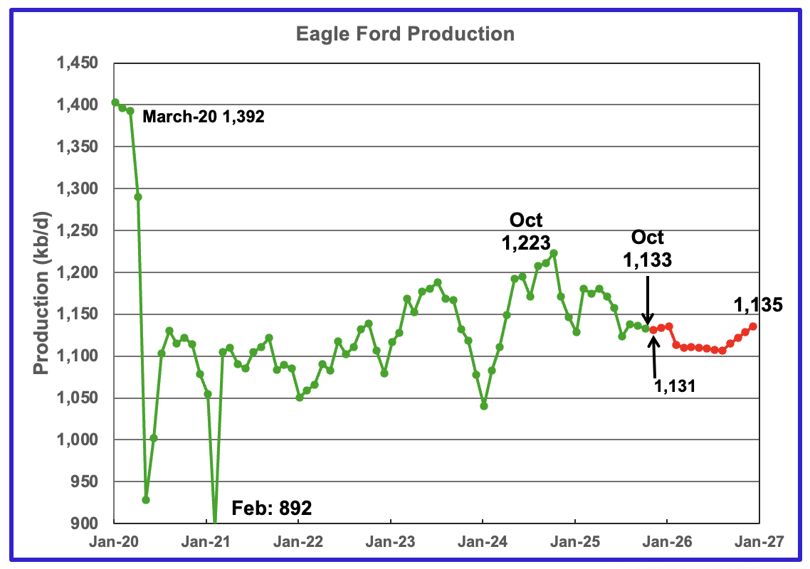 October’s output in the Eagle Ford basin decreased by 3 kb/d to 1,133 kb/d. November’s 2025 production is forecast to drop by 2 kb/d to 1,131 kb/d.