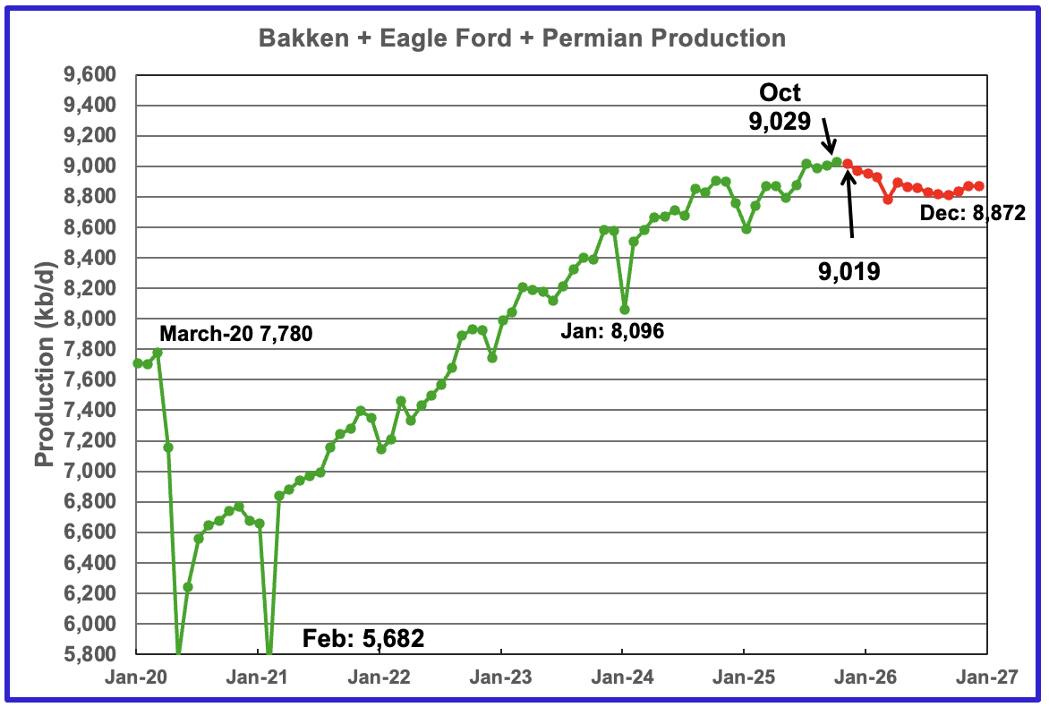 This chart plots the combined production from the three main LTO regions. For October output increased by 27 kb/d to 9,029 kb/d. Production for December 2026 is forecast to be 8,872 kb/d.