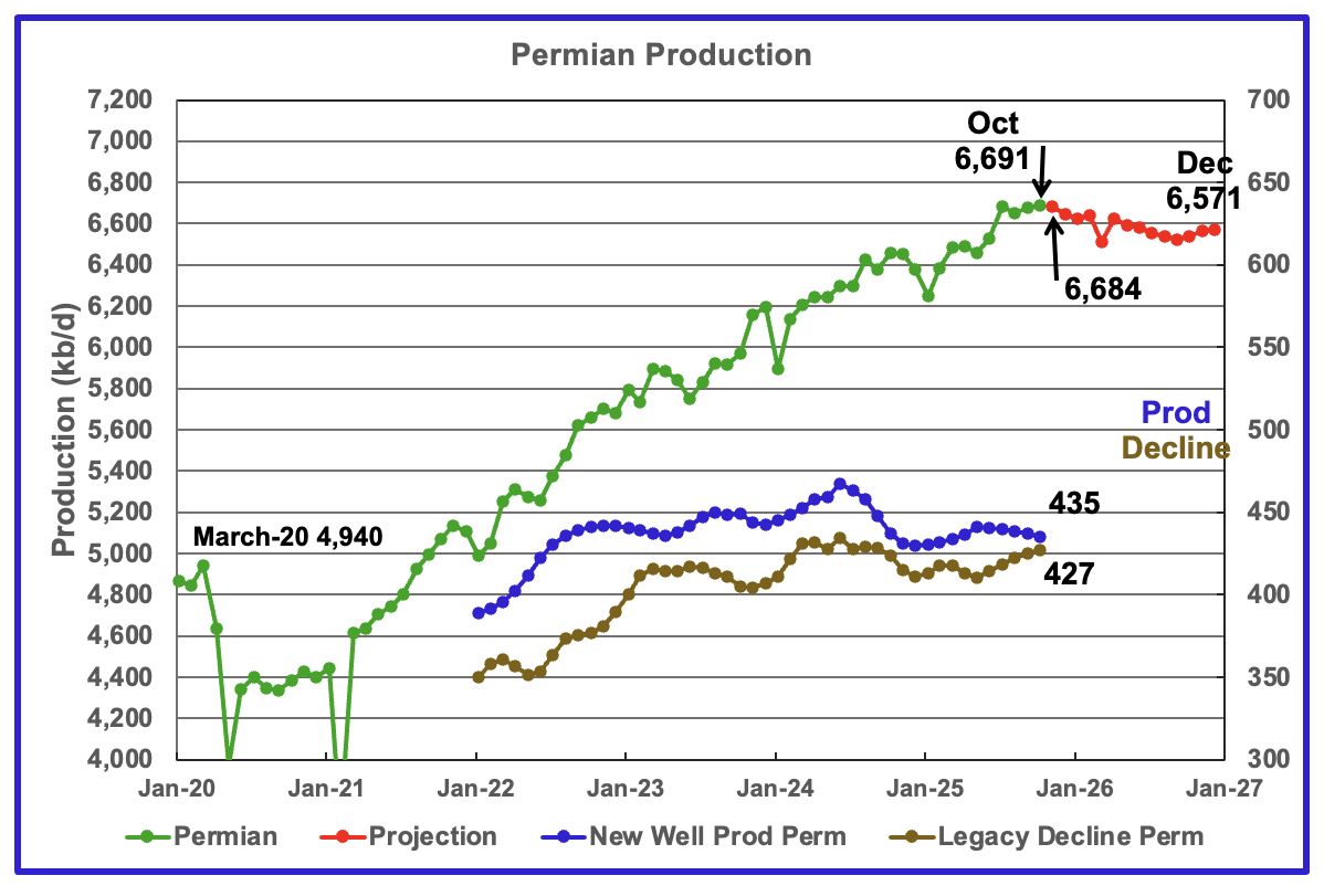 The EIA’s October STEO/DPR report shows Permian October output rose by 14 kb/d to 6,691 kb/d. October is expected to drop by 7 kb/d to 6,684 kb/d. From October 2025 to December 2026 output is expected to drop by 120 kb/d to 6,571 kb/d. Note that December 2026 production has been revised up by 52 kb/d from 6,519 kb/d to 6,571 kb/d.