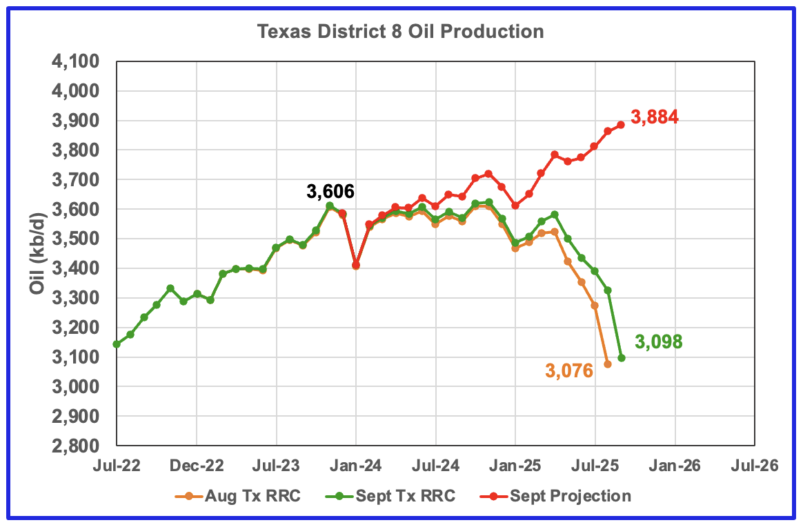 The District 8 production chart is showing rising production. However due to revisions to last month’s production all the way back to April 2024, the projection is optimistic. A more realistic production level for April to July is 3,700 kb/d and 3,800 kb/d for September. Notice that the three green peaks are close to 3,600 kb/d which maybe indicating an upcoming plateau phase.