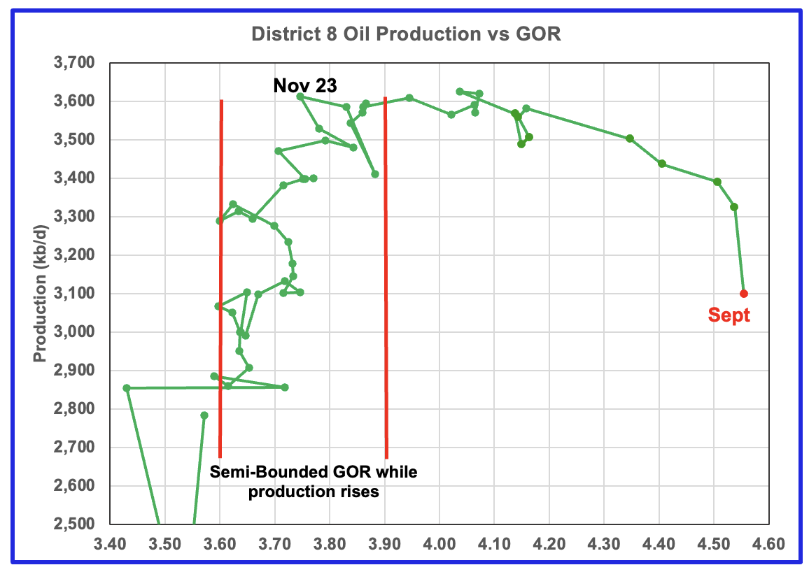 Plotting an oil production vs GOR graph for a district may be a bit of a stretch. Regardless here it is and it seems to indicate many District 8 counties may well be into the bubble point as the September GOR increased slightly to a record 4.55 as the preliminary RRC production fell by 226 kb/d