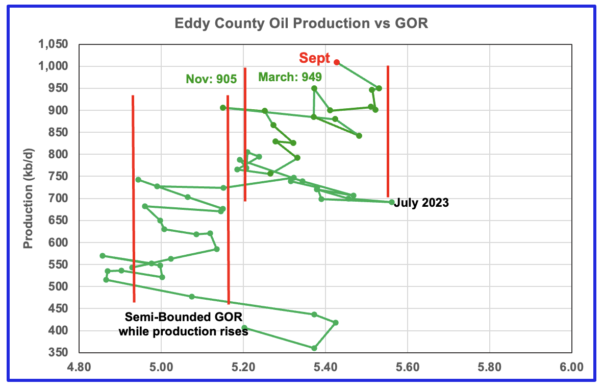 The Eddy county GOR pattern is similar to Lea county except that Eddy broke out from the first semi bounded range earlier and then added a second wider semi-bounded GOR phase. For September New Mexico’s Oil Conservation Division (OCD) reported preliminary oil production increased by 59 kb/d to 1,009 kb/d while the GOR dropped to 5.43 and remained within the second Semi-Bounded GOR range.