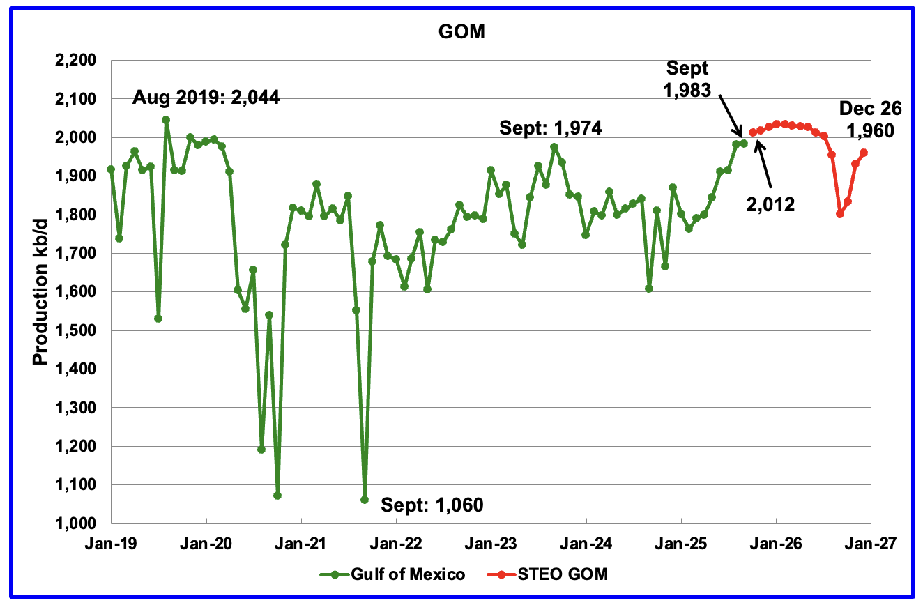 The November 2025 STEO GOM projection has been added to this chart. It projects production in December 2026 will be 23 kb/d lower than September 2025 at 1,960 kb/d.