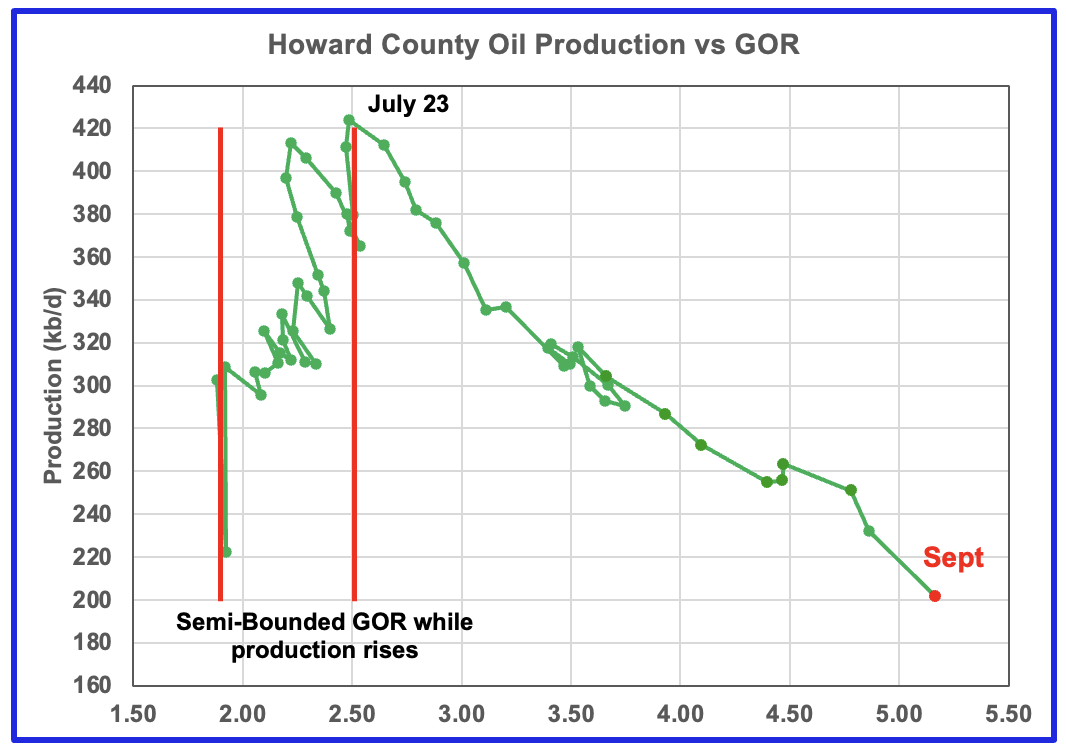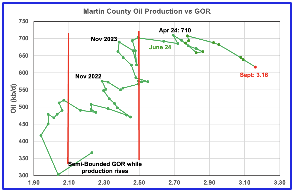 Martin county’s oil production after November 2022 increased and at the same time drifted to slightly higher GORs within the semi bounded range. However the June 2024 GOR saw its first move out of the semi bounded region. The RRC’s preliminary September 2025 production for Martin County shows a 21 kb/d decrease accompanied by an increase to the GOR to 3.16.