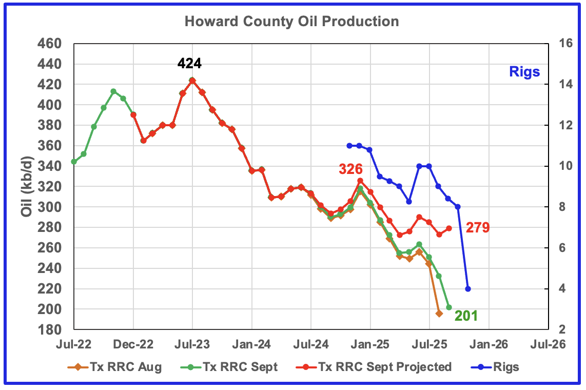 Howard County oil production peaked in July 2023 and has been in a slow decline ever since. The falling production has been falling along with the dropping rig count. In September the projected production rose by 6 kb/d to 279 kb/d. The rig graph is time shifted forward by 5 months.