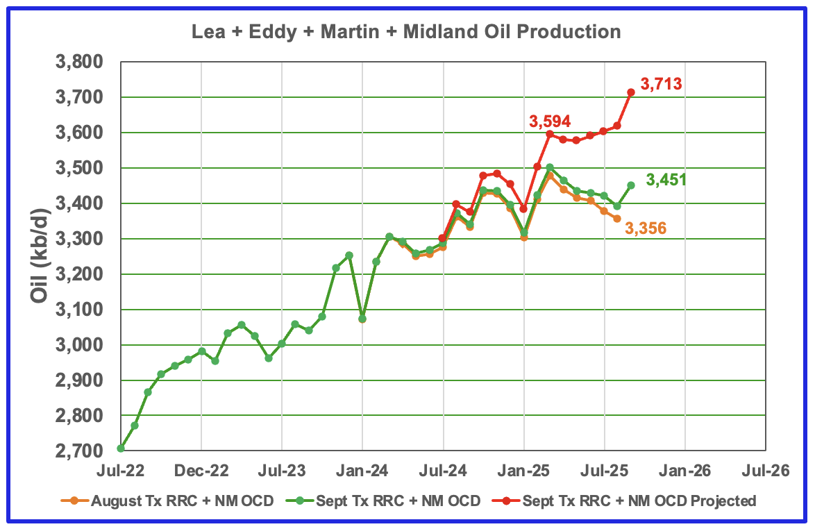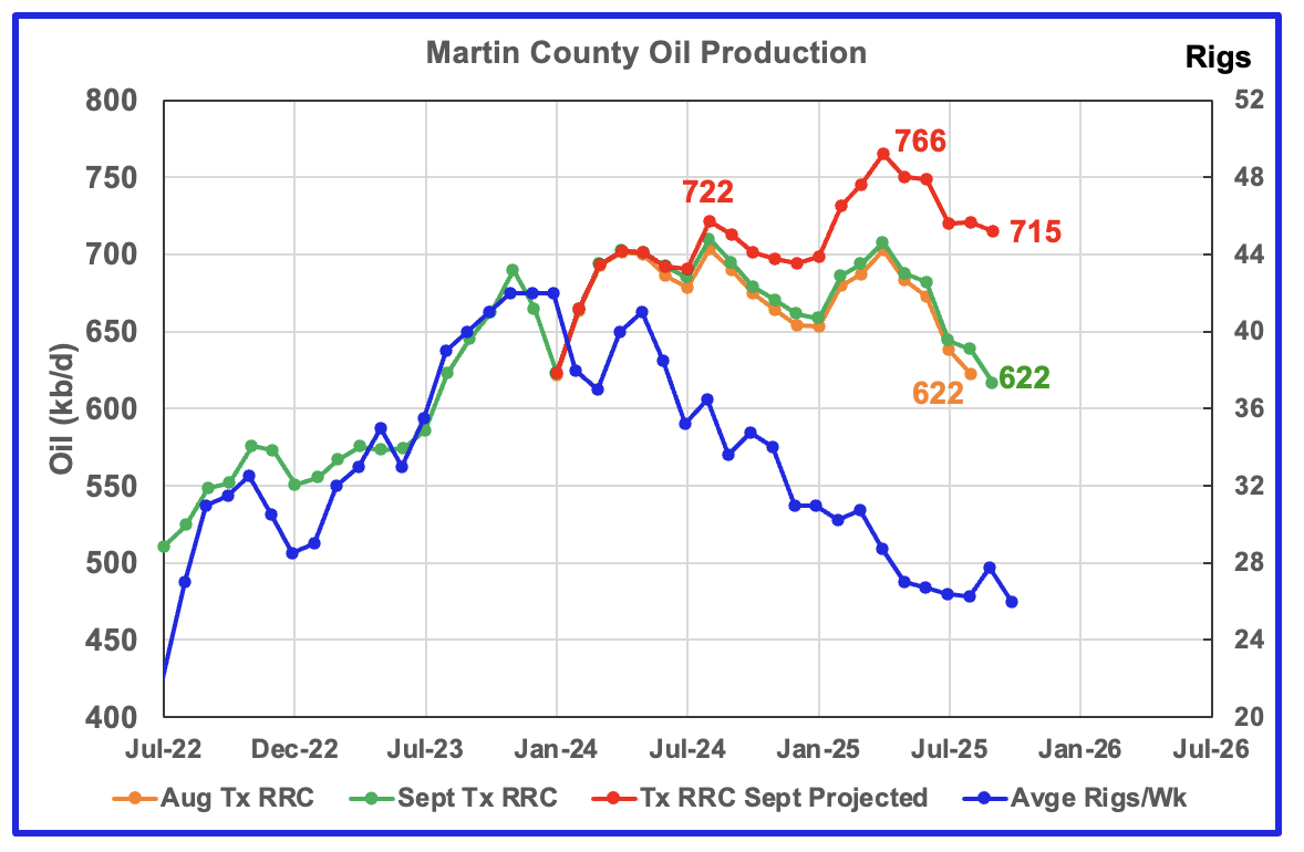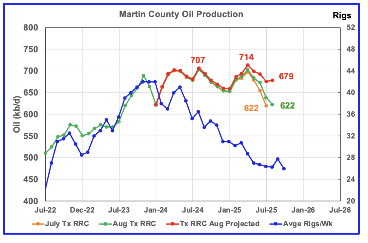 Martin county’s projected September oil production dropped by 6 kb/d to 715 kb/d. I think the September projected production is overly optimistic and a more realistic level would be somewhere between 665 kb/d and 680 kb/d. The April peak is probably closer to 725 kb/d. Note the peak production in the preliminary data for August 2024 and April 2025, green chart are both close to 715 kb/d.