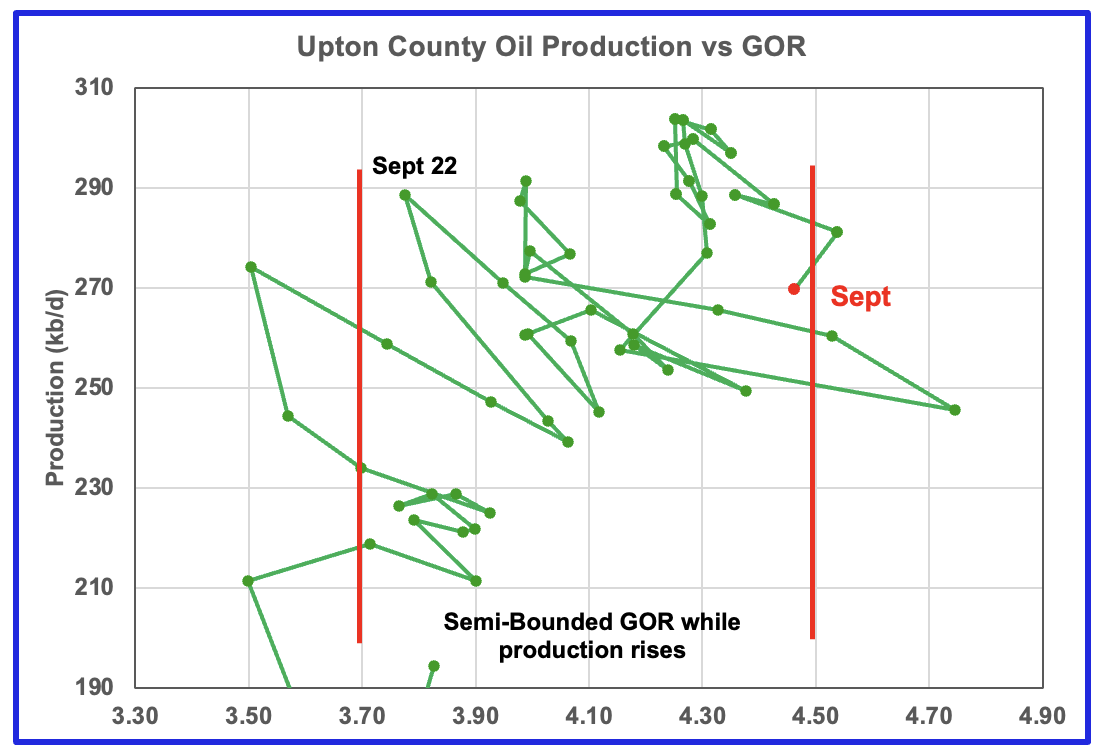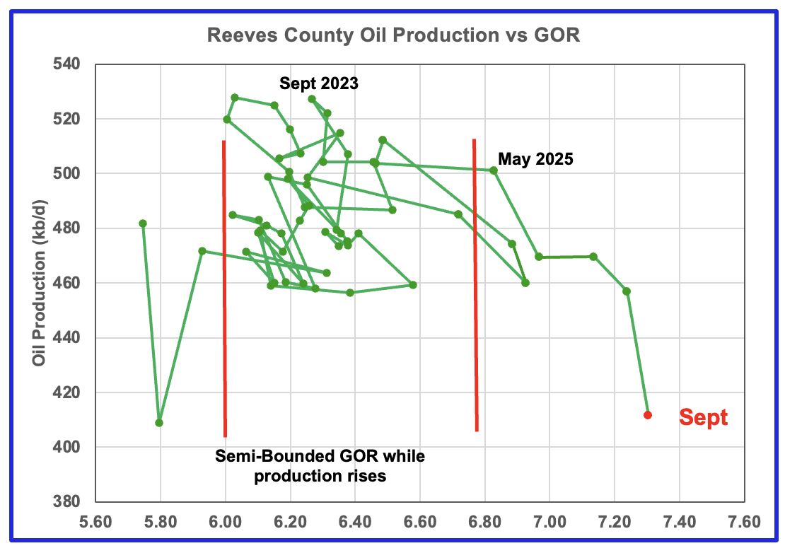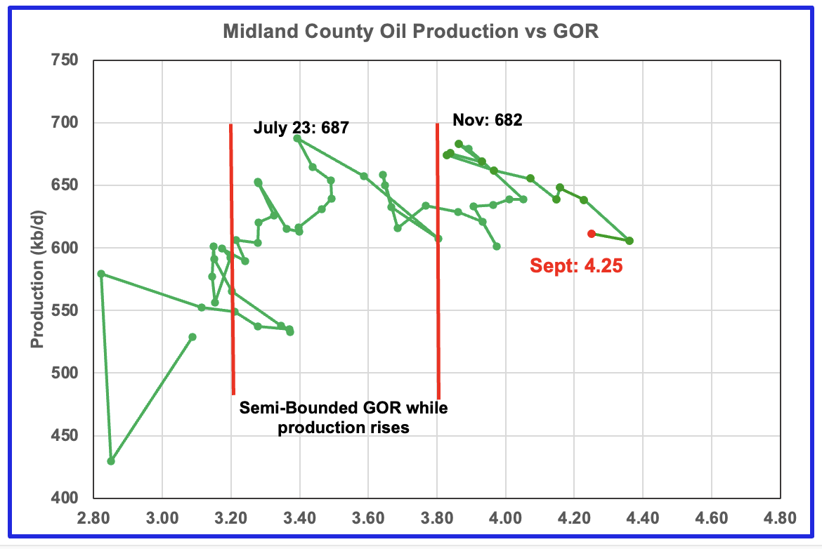 When Midland county GOR initially moved into the bubble point phase, oil production and the GOR stayed within a narrow range of 3.8 to 4.0 outside of the initial Semi-Bounded GOR region from March 2024 to March 2025. However after March, the April to August 2025 GORs broke out to new highs. The September GOR reversed the trend and the dropped to 4.25 but still stayed outside the Semi-Bounded region.