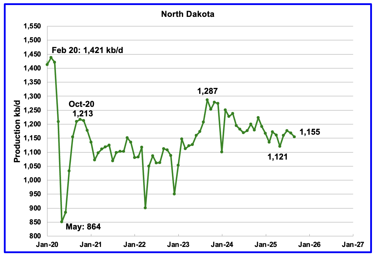 September’s output dropped by 13 kb/d to 1,155 kb/d. Production is down 132 kb/d from the post pandemic peak of 1,287 kb/d.