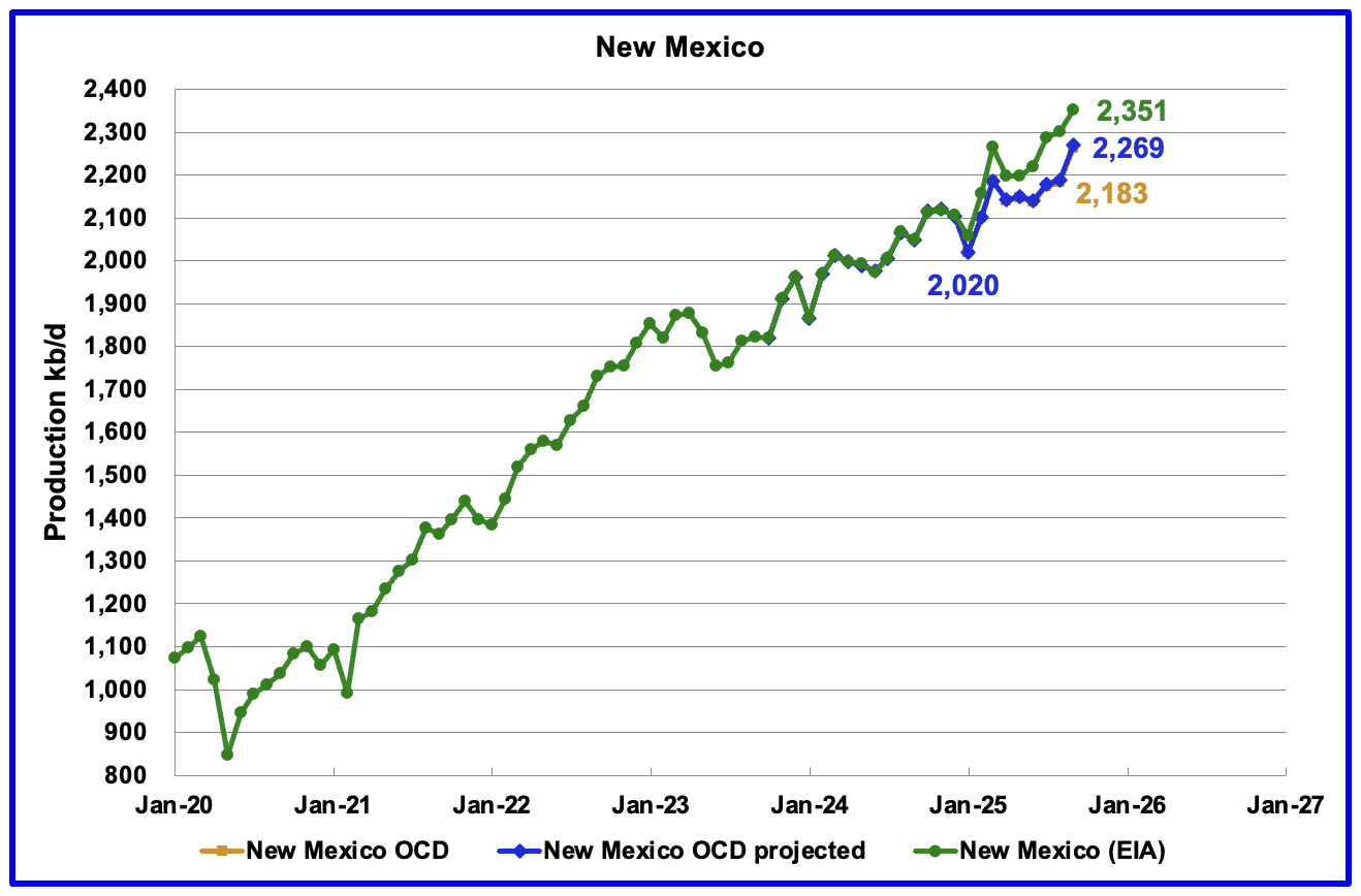 In 2024, from May to September, the EIA over estimated NM production by an average of 30 kb/d, with a high of 40 kb/d and a low of 21 kb/d. In August 2025, the EIA revised its 2024 production numbers to be consistent those reported by the NM OCD. For August 2025, the EIA’s reported production is 2,301 kb/d. The NM OCD is reporting 2,185 kb/d, lower by 116 kb/d.
