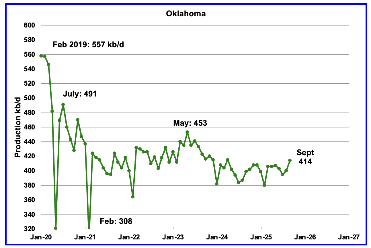 Oklahoma’s output in September rose by 14 kb/d to 414 kb/d. Production remains below the post pandemic July 2020 high of 491 kb/d and is down by 39 kb/d since May 2023. Output entered a slow declining phase in June 2023 and now appears to be range bound around 400 kb/d ± 20 kb/d.