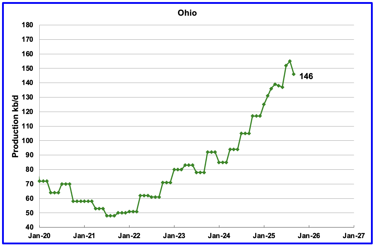 Ohio’s September oil production decreased by 9 kb/d to 146 kb/d. Ohio started the year with 6 NG rigs, In late November Ohio had 11 NG rigs and 1 oil rig operating.