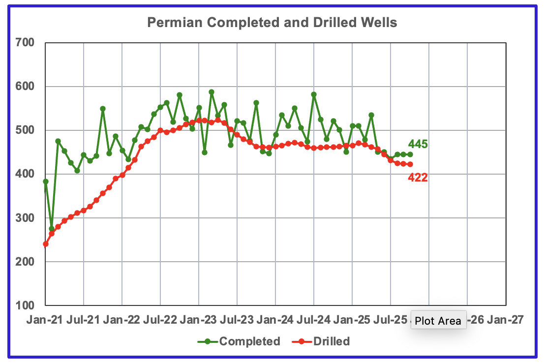 A couple of months back I had the impression that Lea county was on the verge of entering a slowly declining phase. However after looking at this month’s data showing very flat production from April 2024 to August 2025 and a rise in September, one cannot infer/see a start to slowing production.