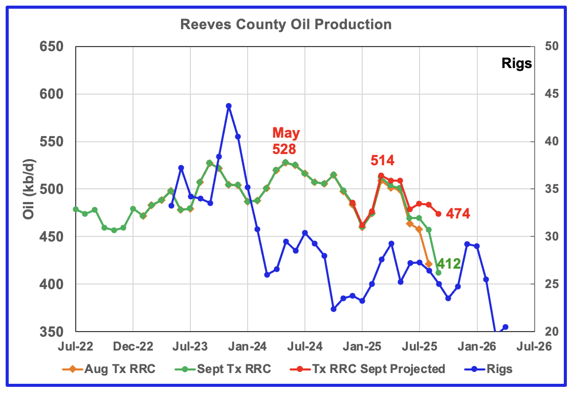 Last month I noted that Reeves August’s production was optimistic and estimated it would be lower at around 540 kb/d. Even that estimate was too high. August has been revised down to 484 kb/d.
