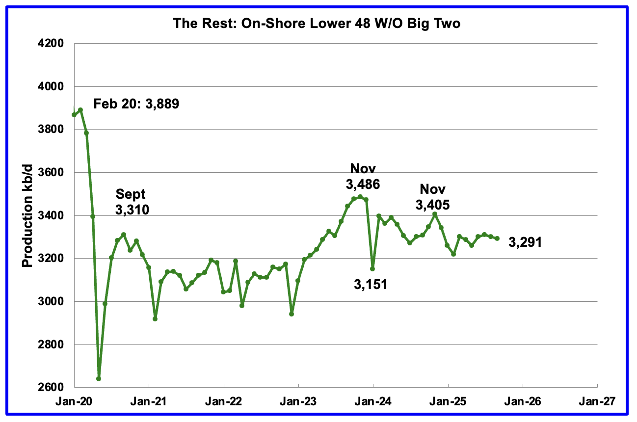 The light blue graph is the STEO’s forecast for the Onshore L48 output to December 2026. From September 2025 to December 2026 production is expected to decrease by 314 kb/d to 11,129 kb/d.