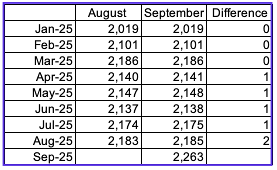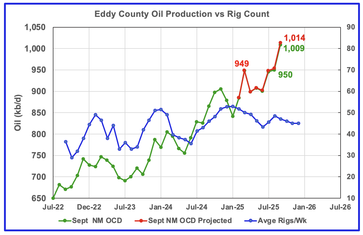 September’s projected oil production increased by 60 kb/d to 1,014 kb/d, a new high while preliminary production from the NM OCD increased by 59 kb/d to 1,009 kb/d. Eddy county’s month over month production updates are very few and small and primarily occur in the last three or four months which indicates their preliminary production is very close to final. This month’s updates/revisions again were minimal. The rising production could be linked to the increasing rig count starting in time shifted July 2025 and could possibly be the beginning of a short increasing phase. Will the falling rig count affect production after September?