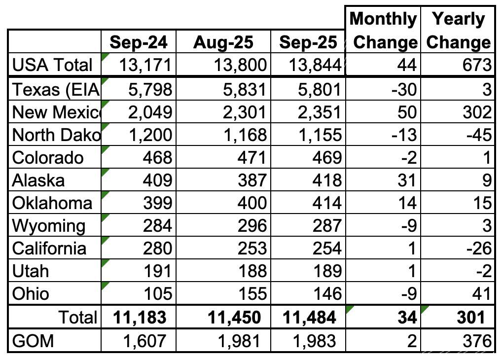 These 10 states accounted for 83% of all U.S. oil production out of a total production of 13,844 kb/d in September 2025. On a MoM basis, September oil production in these 10 states rose by 34 kb/d. On a YoY basis, US production increased by 673 kb/d with the biggest contributors being New Mexico and the GOM.