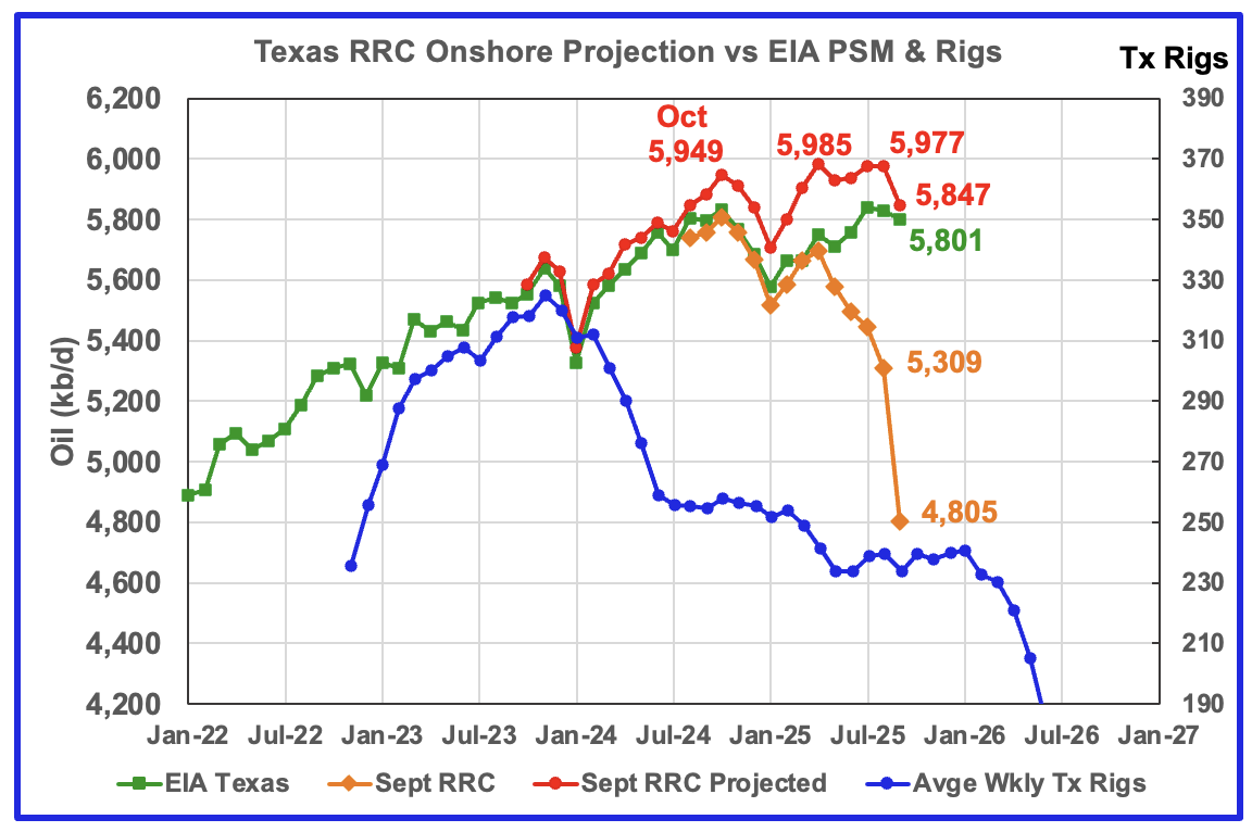 The red graph is a production projection using the August and September Texas RRC data. The projection trend follows the EIA’s production up to August but not for September due to the September initially large 501 kb/d production drop. The four peaks in the projected graph starting in October 2024 indicates that Texas production is close to peaking.