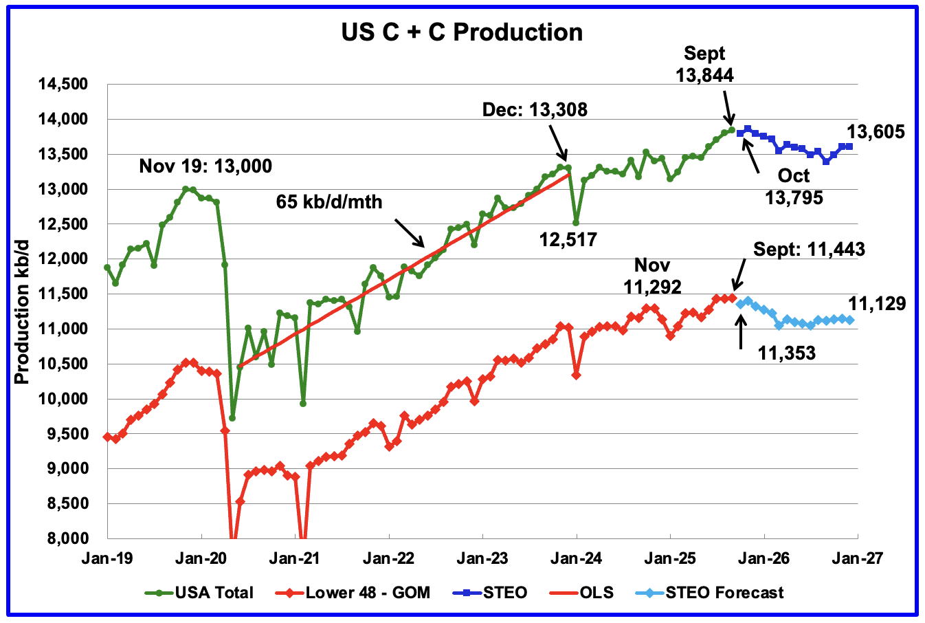 The dark blue graph, taken from the November 2025 STEO, is the U.S. oil production forecast from October 2025 to December 2026. Output for December 2026 is expected to drop to 13,605 kb/d. From September 2025 to December 2026 U.S. oil production is expected to drop by 239 kb/d.