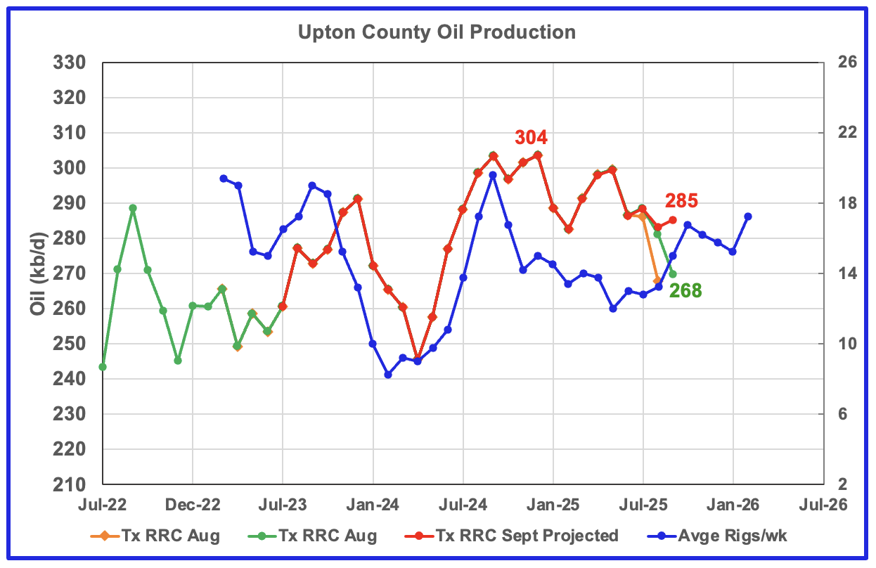 Upton County entered its declining phase in January 2025. September’s projected production rose by 2 kb/d to 285 kb/d. August’s production was revised down from 303 kb/d to 283 kb/d. For the next few months Upton county may see a production increase associated with the rising rig count in time shifted August 2025.
